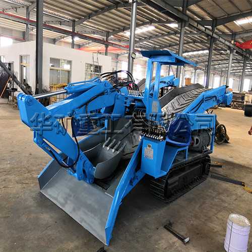 礦用挖掘式裝載機又稱扒渣機,坑道清理機,坑道出渣機。按照行走方式分為輪式和履帶式。它是及液壓行走,挖掘裝置,皮帶輸送,裝車,清理巷道底部五種功能。主要由電動機,液壓行走,挖掘裝置,行走裝置,皮帶輸送卸料和電器控制系統等部分組成。整車液壓系統由一臺15kw電動機為動力帶動齒輪泵,液壓油經油箱到多路閥到執行動作元件再回到油箱,通過多路閥的四個手柄完成對液壓裝置的控制。